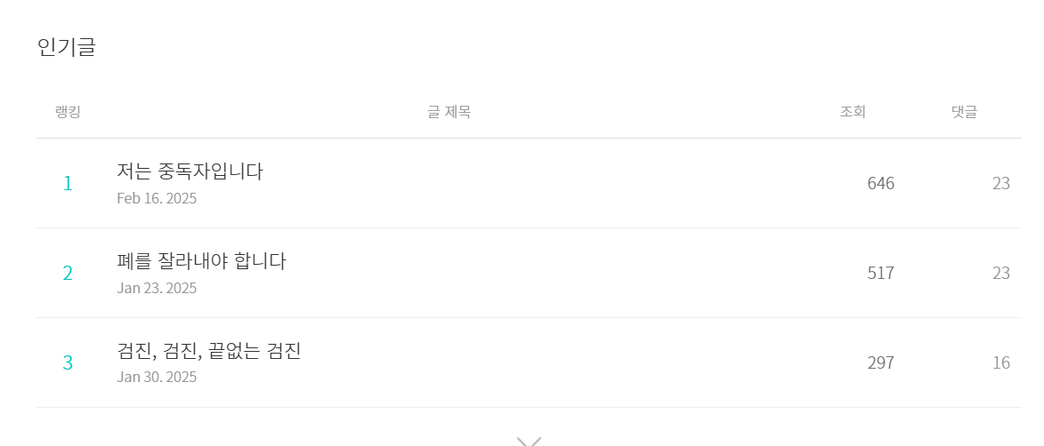 2월의 인기글은 제목으로 어그로를 끌었던 '저는 중독자입니다'가 1위네요. 제목의 중요성을 다시 한번 실감합니다.