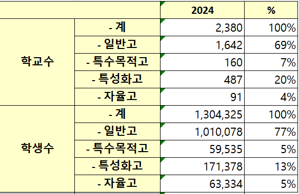 초중등교육법 시행령 기준의 우리나라 고등학교 유형별 학교수 및 학생수를 살펴보자. 2024학년도 기준 전국의 고등학교 수는 모두 2,380 개이며, 이중 약 70%가 일반고이다. 학생수를 기준으로 하면 일반고 비중이 77%까지 늘어난다. 특목고는 5%, 자율고(자사고+자공고)는 5%를 차지하고 있다. 실제로 특목고와 자사고 학생 비중은 한 자릿수에 불과하다 (특목고 중 예고 및 체고, 마이스터고(전국 55 곳) 제외, 자율고 중 자율형 공립고 40곳 제외 시).