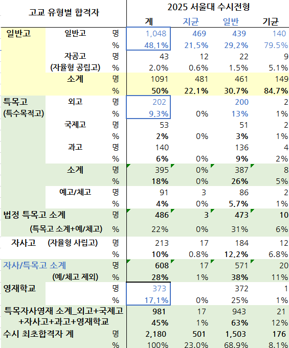 [표 2] 2025 서울대 수시전형 고교유형별 합격자 분포