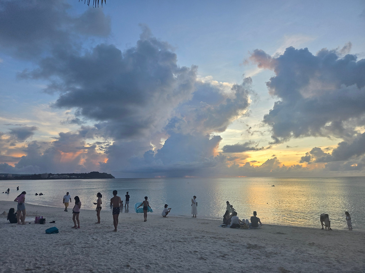 노을 진 괌의 해변가에는 수영복을 입고 거닐거나 바다로 뛰어들어가거나, 바닷속에서 수영을 즐기고 있는 사람들이 꽤 많다. 바다에 들어가 있는 사람들은 해의 기운으로 따뜻한 바닷물 덕분에 추운 줄 모를 것이다. 발밑으로 밀려오는 따스한 물결이 발목부터 천천히 감싸줄 테니까.