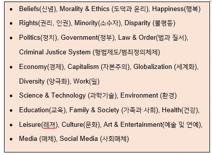 디베이트의 논제 또한 매우 다양하기 때문에 아이의 관심사와 지식이 충분히 확장됩니다. 난이도가 쉬운 수준에서는 아이를 둘러싼 생활이나 조직과 연관된 교육, 가족, 문화, 건강, 레저, 예술, 과학기술, 차별 등 비교적 친숙한 주제가 많이 등장합니다. 디베이트 난이도가 올라가면 좀 더 고차원적인 인권, 범죄, 정부 정책, 정치, 세계화, 경제, 미래 과학기술 관련 딜레마 등에 관한 주제가 다루어집니다.