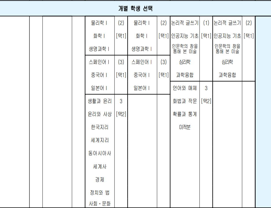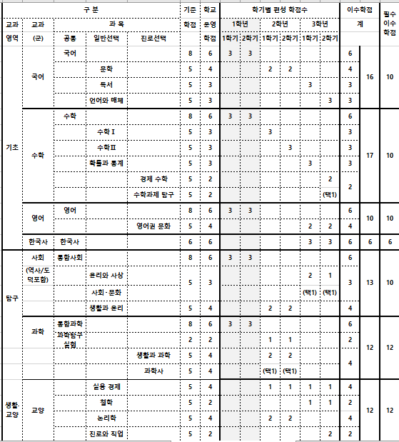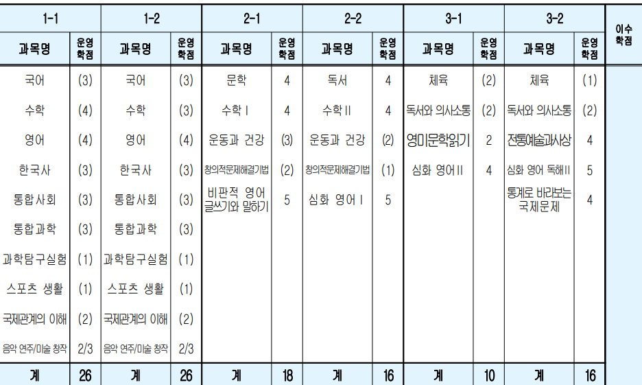 *주요 학교의 2024학년도 신입생 교육과정 편제표는 학교 알리미 사이트에서 각 학교의 자료를 다운로드하여 편집함. 편의상 체육 및 예술 교과과정은 표에서 생략함.