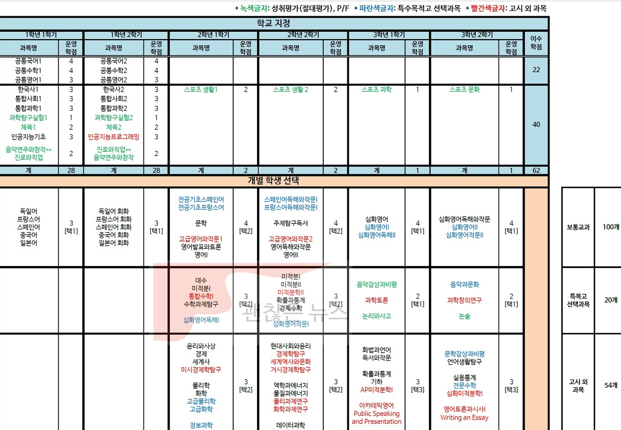 괜찮은 뉴스에서 발췌위 표의 상단을 보면 학교지정으로 표시된 하늘색 부분에는 여느 고등학교와 동일한 교육과정을 배치해 놓았다. 그 바로 밑에 개별학생선택으로 표시된 살구색 부분이 차별적인 교육과정이다. 외대부고는 외대부속학교답게 다양한 외국어를 선택할 수 있었다. 그러나, 2022 교육개정을 통해 8개 외국어에 대한 외고 과목들이 일반고 교과정에 모두 들어온 것에 대비하여, 일부 교과목을 업그레이드하여 학교의 특색을 드러냈다. 예를 들면, '전공기초중국어'와 '중국어 독해와 작문' 과목은 이제 어느 학교나 개설할 수 있기에 기존의 '중국 문화' 과목을 '중국언어와 역사의 이해'라는 과목으로 업그레이드했다. 표의 맨 밑 부분 보라색으로 표기된 소인수 선택과목의 붉은색 글씨로 된 과목을 보면 된다. 파란색 과목 일부와 붉은색 과목은 모두 외대부고만의 특색 있는 대학교 이상 수준의 과목들인데, 과목 수가 매우 많은 점이 여러분 눈에도 들어올 것이다. 국제계열까지 있지만, 전체 과목수가 무려 174개에 이르고 있다.