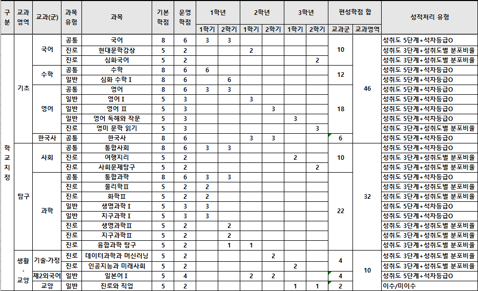 *주요 학교의 2024학년도 신입생 교육과정 편제표는 학교 알리미 사이트에서 각 학교의 자료를 다운로드하여 편집함. 편의상 체육 및 예술 교과과정은 표에서 생략함.