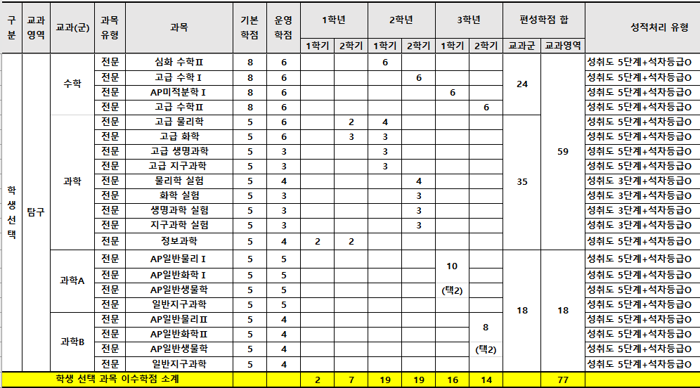 출처: 학교 알리미 공지자료 발췌우선 성적처리 유형이 일반 학교와는 다르다는 것이 눈에 띈다. 과학고는 영재학교와 달리 고등학교에 속하므로 9등급제의 상대평가를 해야 하는데, 유난히 3단계의 성취도 평가, 즉 절대평가를 산출하는 과목이 많다. 그 이유는 무엇일까? 바로, 과목 유형이 '진로'인 심화과목들이 다수 포진되어 있기 때문이다. 즉, 주요 과목 중 고등학교에서 필수로 이수해야 하는 커리큘럼은 영어를 제외하고 1학년 때 거의 끝나고, 1학년 2학기부터는 심화과목을 본격적으로 이수하게 된다. 잠시 1학년 1학기 편제를 살펴보자. 중학교를 갓 졸업한 아이들은 1학년 1학기에만 통합과학부터 과학 다섯 과목을 한 번에 수강한다. 심지어 물리학 I과 화학 I을 건너뛰고 바로 물리학 II와 화학 II부터 수강한다. 1학년 2학기에는 통합과학부터 생명과학 II, 융합과학탐구(과학고 외에는 최상위권 자사특목고에만 개설된 심화 과목)까지 과학 네 과목이 배정되어 있다. 수학은 비록 한 과목이나, 6 시수나 된다. 1학년 2학기에 수준 높은 심화수학 I(역시 과학고 외에는 최상위권 자사특목고에만 개설된 심화 과목)을 수강한다.