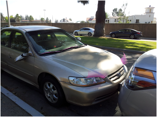 <학교 캠퍼스에 주차되어 있던 깜찍한 차. 핑크 속눈썹을 애교 있게 깜빡이며 앞차에 뽀뽀하고 있다. 최고급 슈퍼카, 수십 년 된 클래식카, 부서진 범퍼를 청테이프로 칭칭 감고 다니는 차, 깨진 사이드 미러를 줄로 묶고 다니는 차. 미국 도로에는 차마저 브랜드도 제각각, 모양도 특색도 제각각이다.