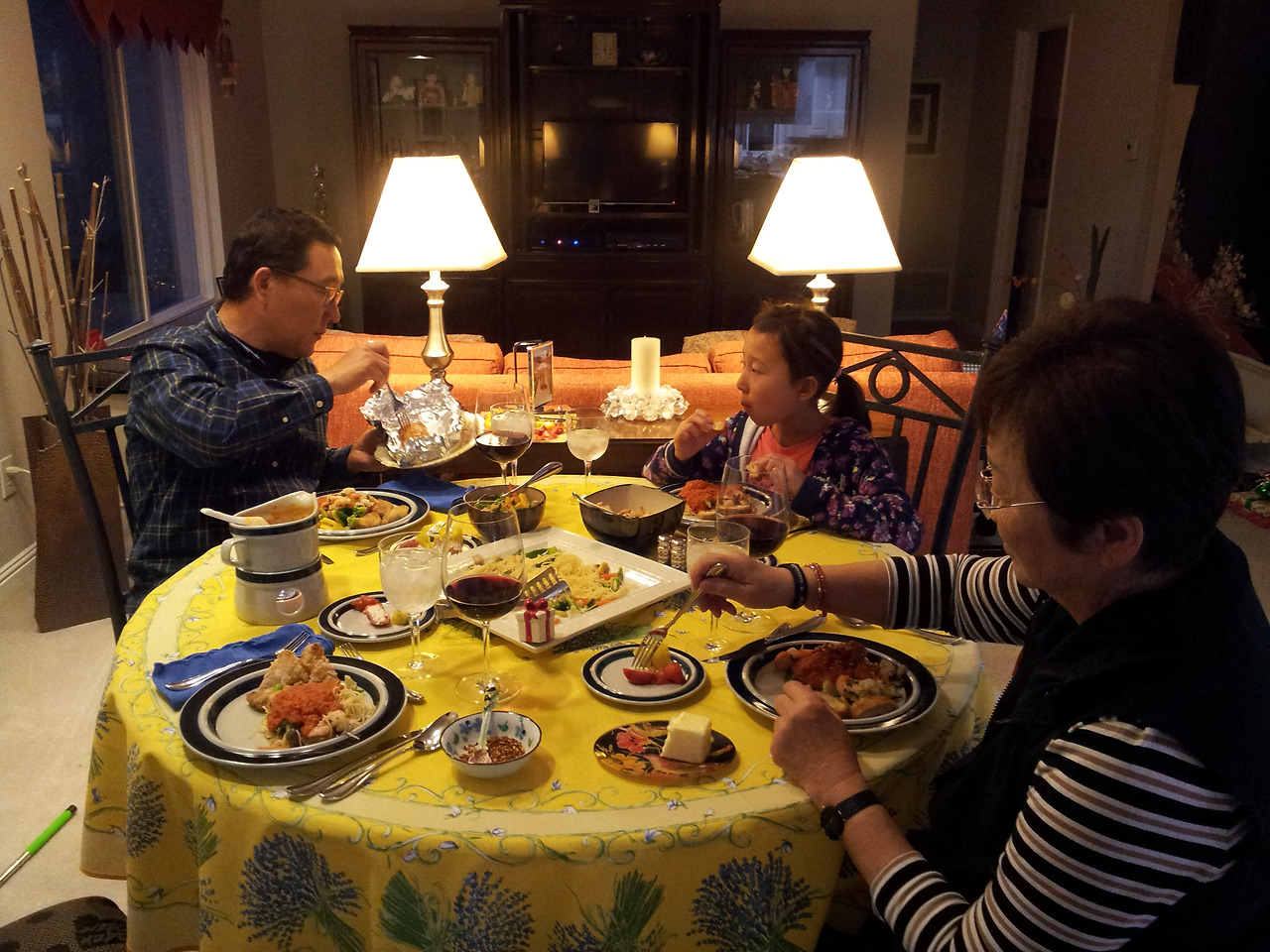 미국에서는 음식의 종류나 양이 넘쳐나지 않는다. 처음에 음식을 통째로 담아내고 부족하더라도 더 채워 넣거나 다른 음식을 더 내어오지 않는다. 고기나 생선 등의 메인 요리, 샐러드류, 익힌 야채류, 탄수화물류(파스타나 빵, 감자 등)이 각각 한 가지씩 차려지는 것이 일반적이다.