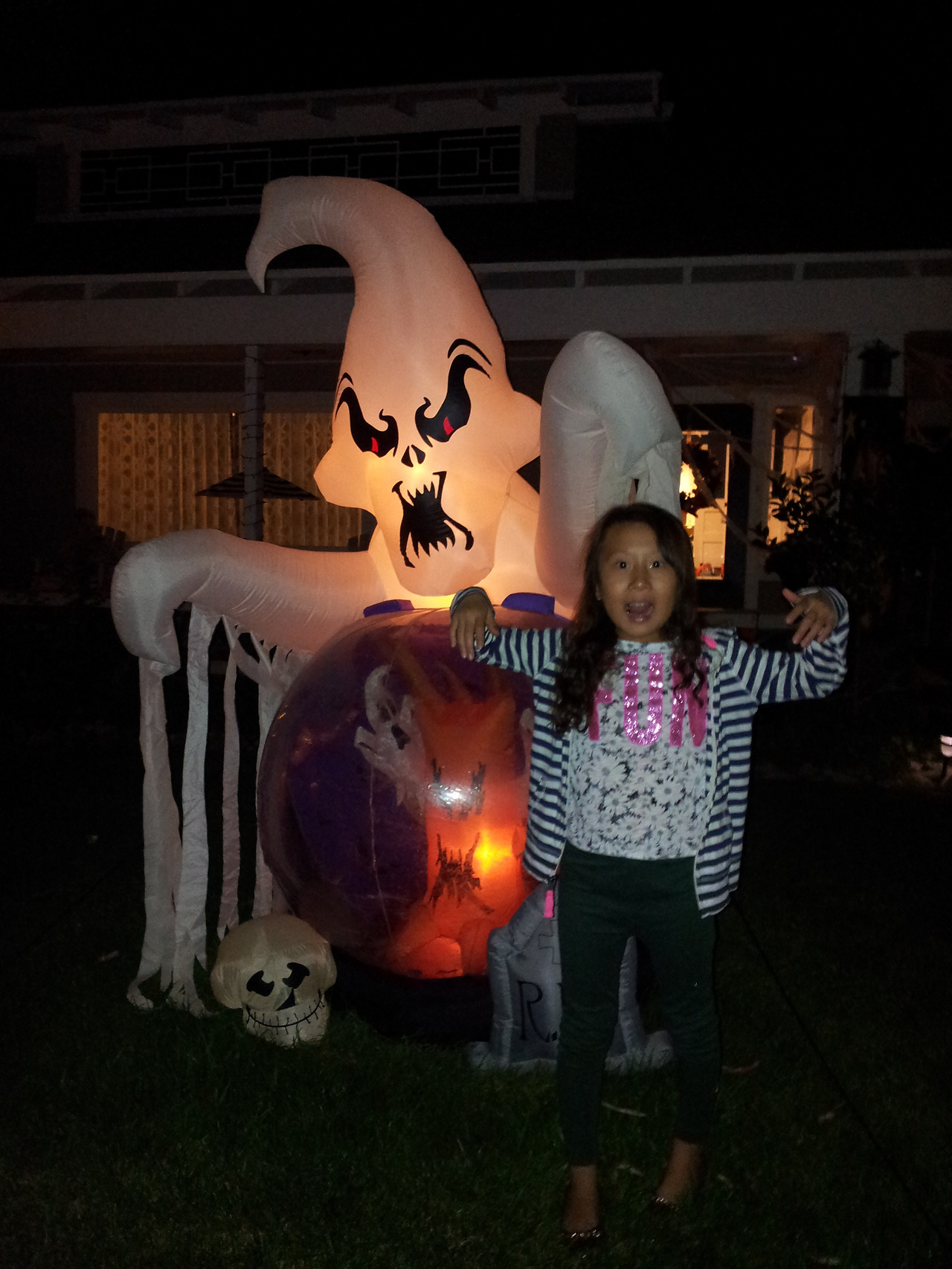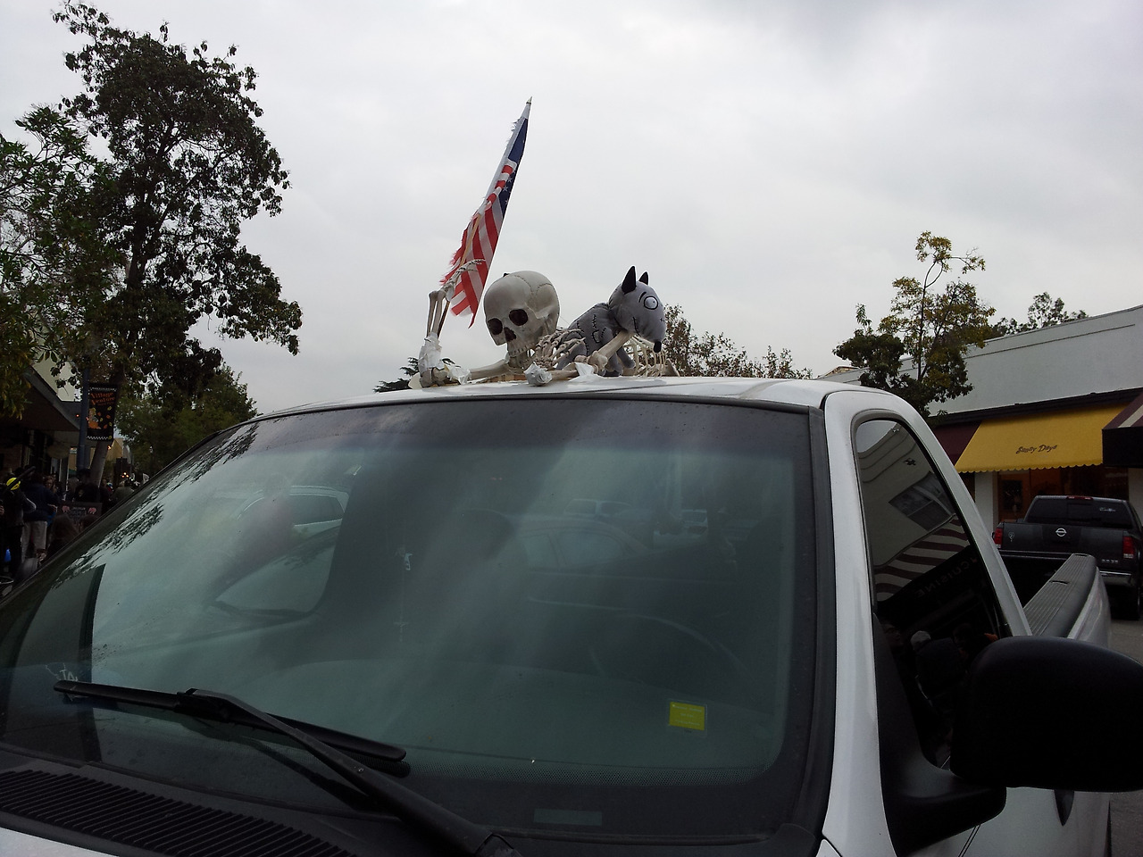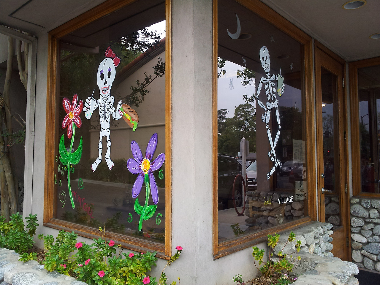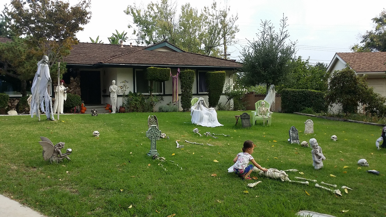 차 위에는 해골을 싣고 다니고, 집집마다 정원에는 온통 비석과 유령 장식이 가득하다. 카페 유리창에도 해골이 있다. 세 살이던 둘째는 겁도 없이 해골 갈비뼈를 살살 만져보았다.