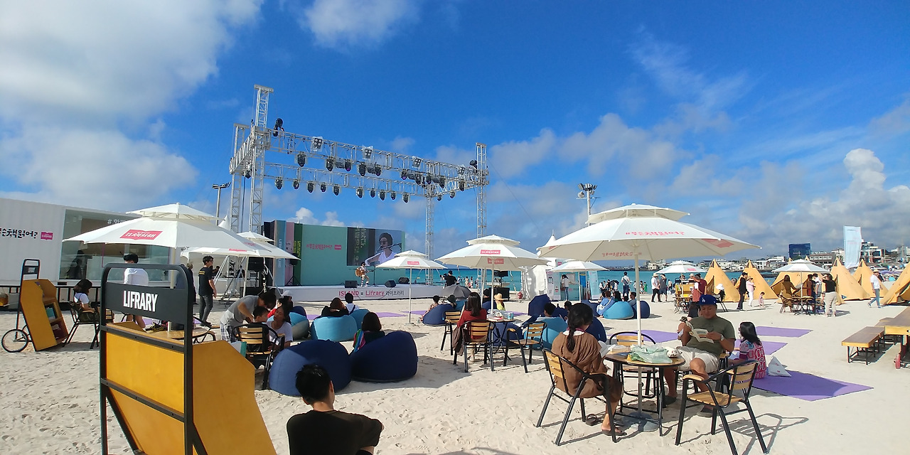작년 가을 협재해수욕장을 찾은 날, 운 좋게도 라이프러리(Life+Library)라는 책 축제를 하고 있었다. 해변에 놓여진 책장과 북트럭에서 읽고 싶던 최신간과 베스트셀러 책을 자유롭게 뽑아들고 인디언텐트나 빈백소파와 물아일체 되어 책도 읽고, 가수들의 공연과 팟캐스트 진행도 감상했다. 해가 지면 공짜로 나눠주는 제주에일 맥주를 들고 (절로 캬아~~~소리가 난다) 파도소리 들으며 사방으로 책에 둘러싸여 있으니 그야말로 완벽한 휴가였다.