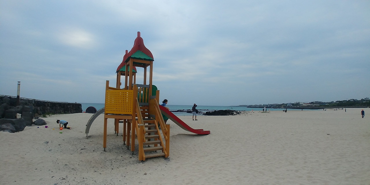 모래사장에 작은 놀이터가 있는 곽지해수욕장