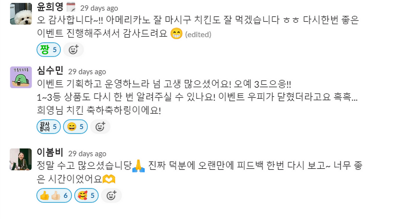 이벤트가 종료되고 감사의 메세지를 전해 받은 팀원들의 반응은 뜨거웠습니다!