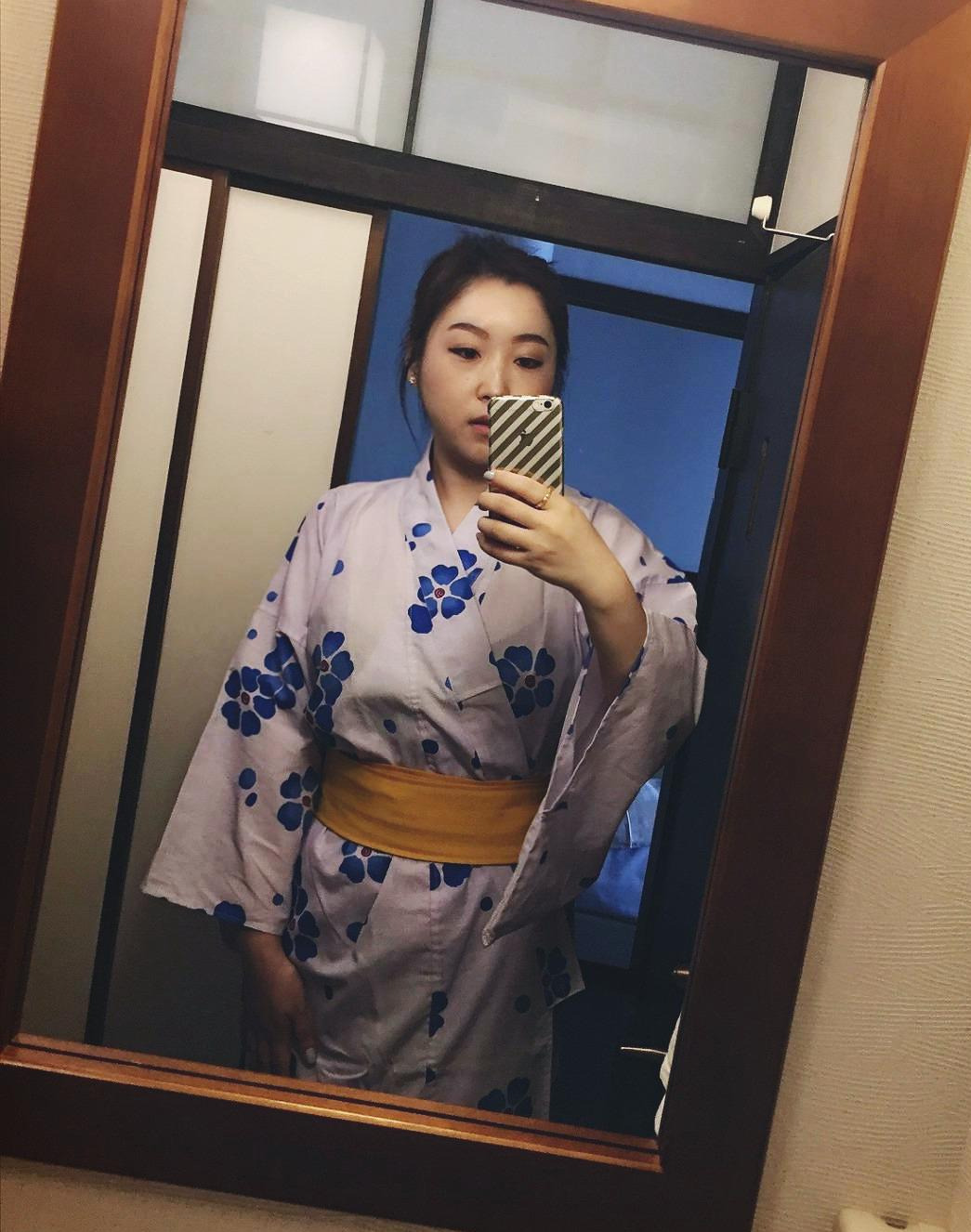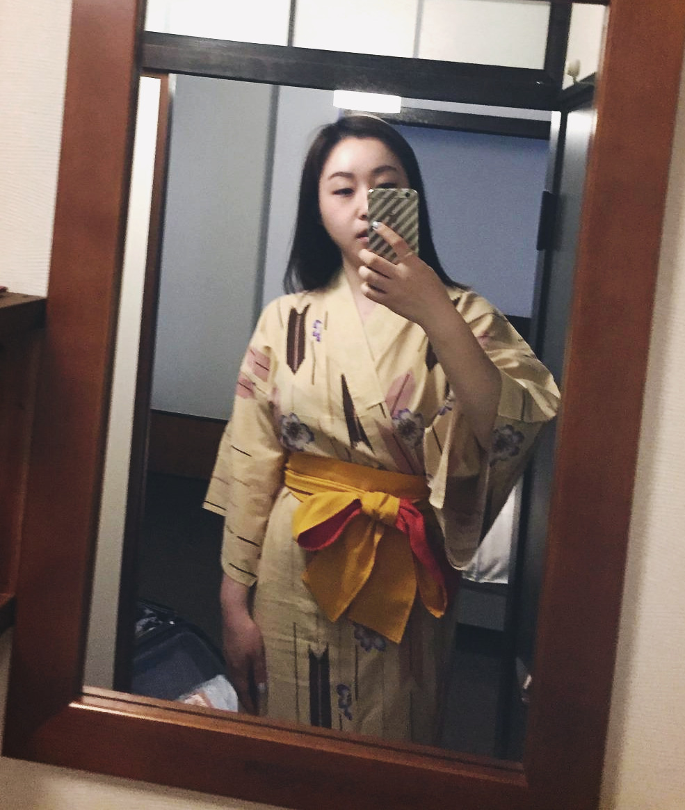 이틀 동안 돌아다니며 수많은 유카타를 보니 여자들의 유카타는 색깔이 쨍하고, 밝고 화려할수록 더 예뻤다. 혼자 다니는데 튀는 게 싫어 베이지 색을 골랐는데, 사이즈를 바꾸러 갔을 때 LL 사이즈는 연보라색 하나뿐이었다. 선택의 여지가 없어 골랐지만 여행이 끝나고 사진을 보니 화사한 연보라 색이 베이지보다 더 예뻤다.