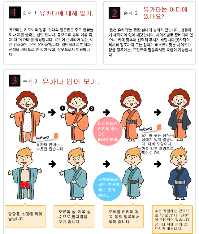 유카타는 "옷자락이 복사뼈 정도까지 오는 길이가 베스트"라고 쓰여있다. 키가 165cm~168cm이면 L이 맞는다. 170cm 정도인 나는 일본인 직원이 보기에 L도 짧다며 LL이 맞다고 했다. LL 사이즈라니 자존심은 상했지만 168 이상인 분들은 처음부터 L 사이즈를 입어보는 걸 추천한다.