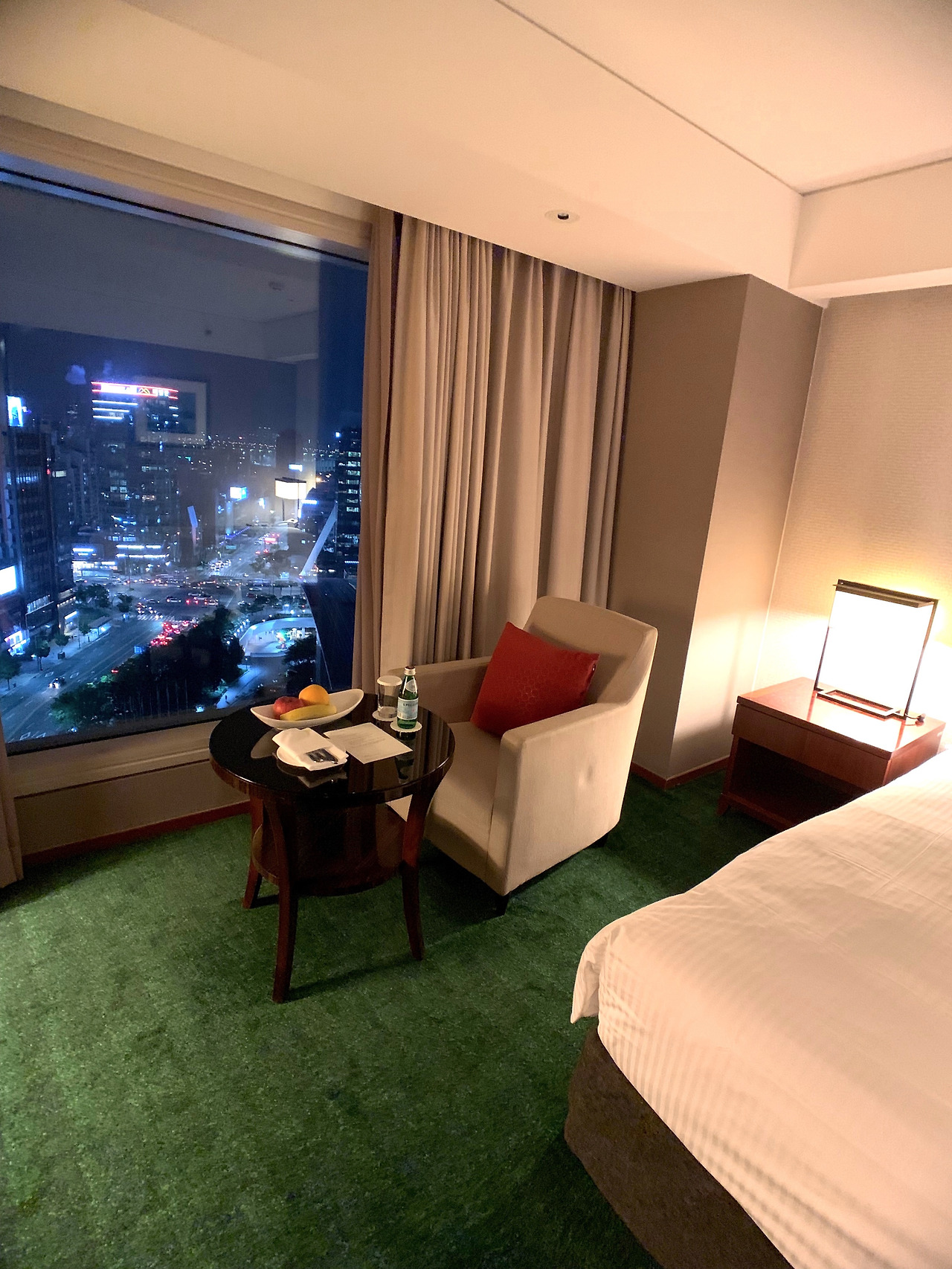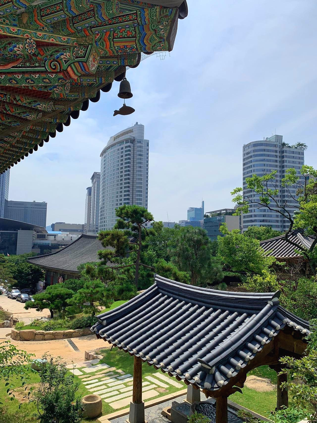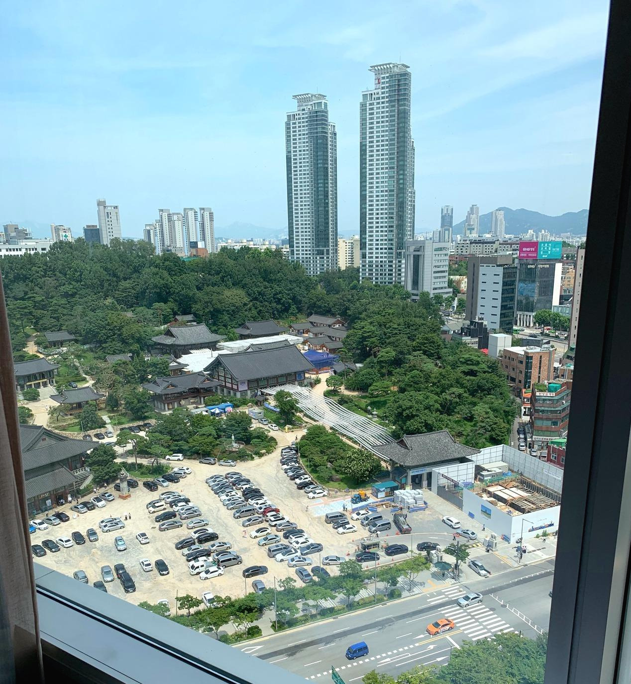기대감이 한껏 올라간 채 문을 열어보니 훤하게 큰 방이 우리를 맞았다. 강남에 있는 호텔방이 이렇게 넓을 줄이야. 지역이 지역인 만큼 방 크기는 기대 안 했는데 땅덩이가 훨씬 더 큰 미국 호텔들보다도 넓은 방에 속이 다 시원했다. 탁 트인 창밖으로 보이는 봉은사 뷰는 이 호텔에서 선호되는 전망인지 체크인 직원이 봉은사 뷰로 업그레이드해 줬다고 했었다.