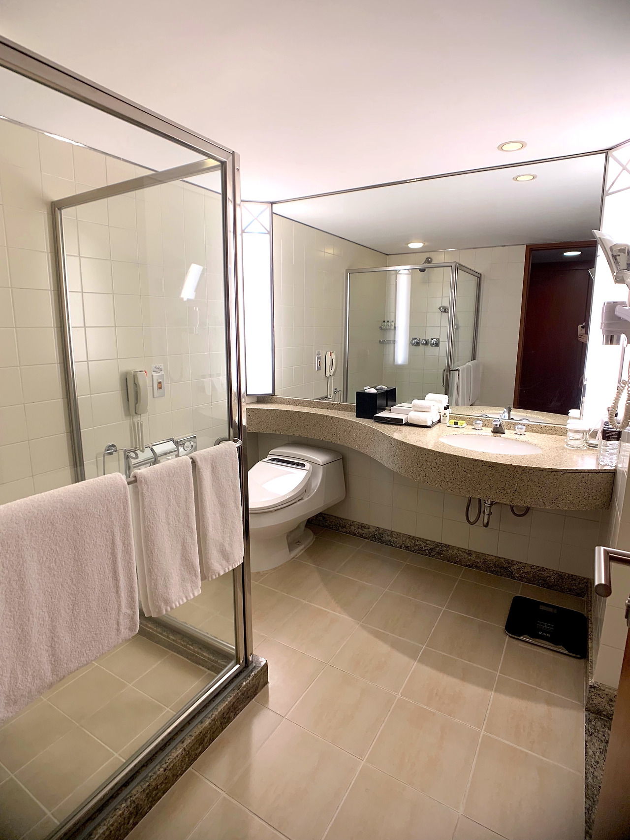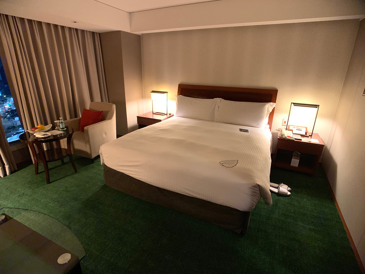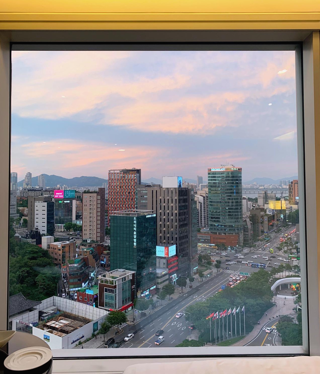 기대감이 한껏 올라간 채 문을 열어보니 훤하게 큰 방이 우리를 맞았다. 강남에 있는 호텔방이 이렇게 넓을 줄이야. 지역이 지역인 만큼 방 크기는 기대 안 했는데 땅덩이가 훨씬 더 큰 미국 호텔들보다도 넓은 방에 속이 다 시원했다. 탁 트인 창밖으로 보이는 봉은사 뷰는 이 호텔에서 선호되는 전망인지 체크인 직원이 봉은사 뷰로 업그레이드해 줬다고 했었다.