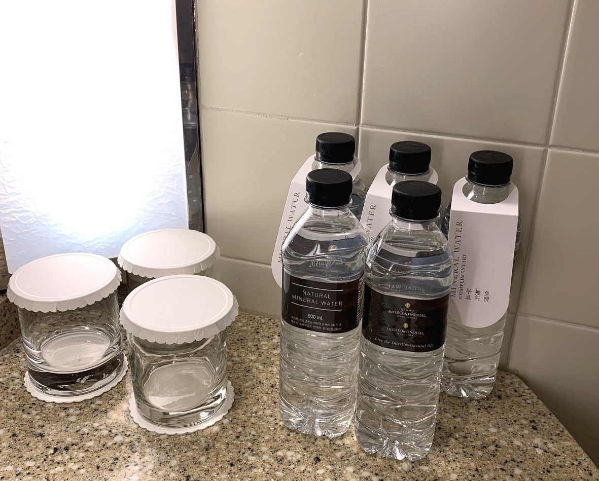 물을 많이 마시는 편이라 호텔 가는 길에 넉넉히 사갔는데 방 입구 있는 커피머신 옆에 물이 네 병이나 있었다. 욕실에도 다섯 병이 더 있었다. 우리가 체크인을 한 후에야 청소 마무리를 했던 게 미안해서 여분을 두고 가셨나 했는데 이튿날에도 똑같은 수의 물이 있는 걸 보니 원래 방침인 듯했다.