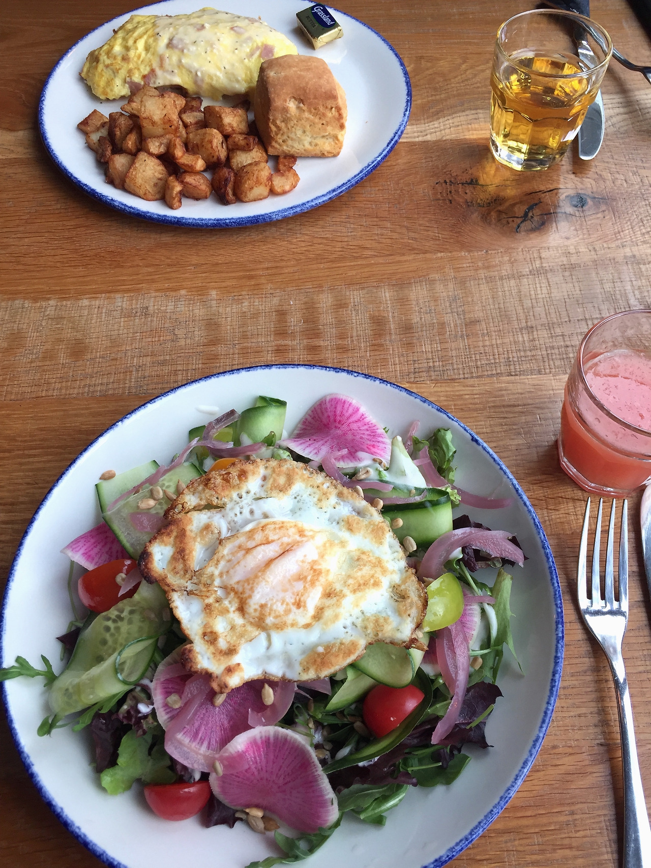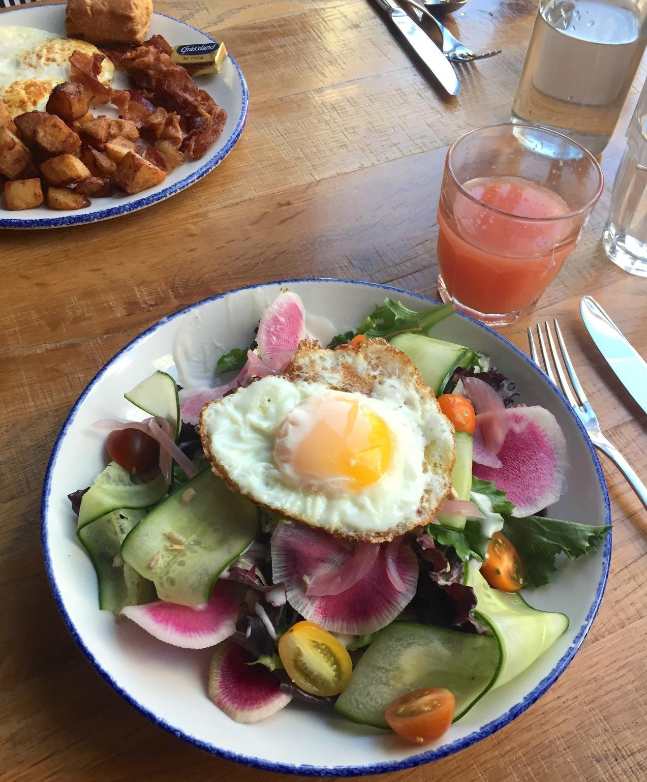 5일째 아침엔 어제의 긍정적 경험을 바탕으로 샐러드를 시켰다. 나름 사진이 예쁘게 나오도록 써니 사이드 업으로 주문해 대미를 장식했다. 첫날부터 변하지 않은 건 자몽주스뿐이었다.