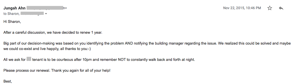 위층의 노력에도 불구하고 그가 일주일에 서너 번씩 벌리는 잦은 파티와 많은 사람들이 쿵쿵거리며 걷고 떠드는 소리 때문에 수시로 이사 나갈 생각을 하며 살다가, 다른 건 다 좋은데 위층 때문에 이사 나가겠다고 하니 적극적으로 개입해서 해결한 아파트 관리회사 덕에 극적으로 재계약을 했고, 그 이후엔 서로 이해하고 조심하며 큰 불편함 없이 지내고 있다.