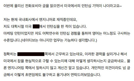미국에서 인턴십을 하고 현재 국내 기업에서 일하는 분이었는데 한국에서 미국으로 현지 취업 방법이 있는지에 대한 질문이었다. 바로 답장을 보냈지만 이메일이 되돌아왔다. 다른 연락방법은 없어서 그다음 올렸던 글 첫머리에 그분을 찾는 공지도 띄웠지만 답이 없었다.