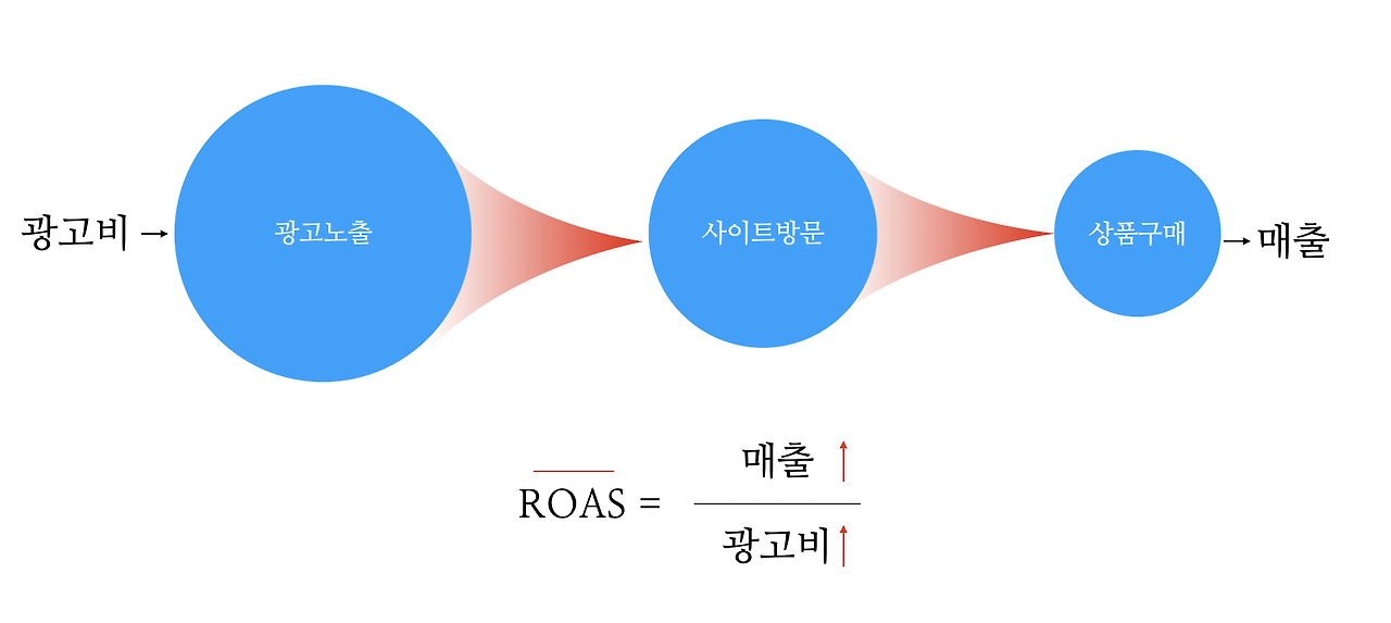 매출을 키우는 방법은 두가지가 있다. (1)광고비를 전월과 유사한 수준으로 집행하되 ROAS를 끌어올리거나 (2)ROAS를 유지한 상태에서 광고비를 늘리는 방법이다. ROAS는 일정 수준에 도달하면 더이상 끌어올리는데 현실적으로 어려움이 있으므로 일반적으로는 매출을 끌어올리기 위해 ROAS는 일정 수치를 유지하면서 분모인 광고비 집행금액을 키워 매출을 확대하는 방향을 채택하게 된다.