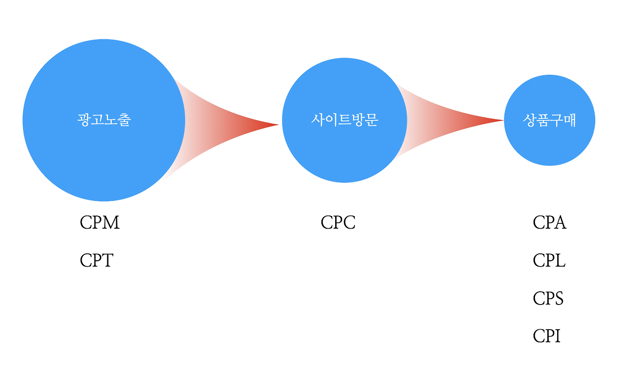 : 1회 전환을 기준으로 과금하는 방식. 전환의 종류는 다양하다. 가입이 될수도 있고, 구매 또는 앱의 경우 설치가 될 수도 있다. 전환의 정의에 따라 CPL, CPS, CPI로 나뉜다.