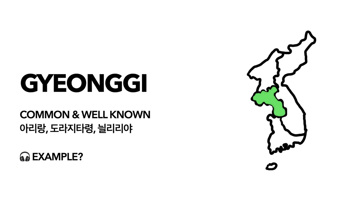'경기'라는 말을 들으면 '경기도'를 떠올리기 쉽다. 하지만 민요 세계에서 경기는 경기도의 지역적 범위보다 넓은 '중부 지역'이라고 이해하면 좋겠다. 서울, 인천, 경기, 충청 일부 지역을 포함한다. 대표 곡으로는 아리랑, 도라지 타령, 태평가, 그리고 늴늬리야가 있으며, 경쾌하고 맑은 소리가 특징이다. 남도 민요에 비해 멜로디가 극적으로 변화하지 않는다. 보통 우리가 흥얼거릴 수 있는 민요라는 점에서 common & well-known 이란 단어를 포함시켰다.