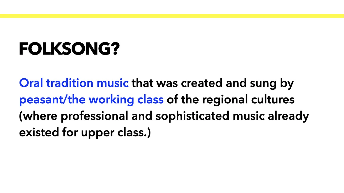 정리하자면, '민요'란, 양반이나 왕족이 아닌 일반 시민에 의해 생성되어 불러진 구전 전통 음악이다. 다음의 두 가지 어휘를 기억해 두면 좋다.