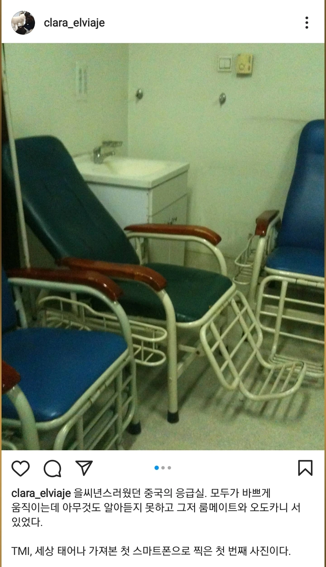 중국어를 조금 할 줄 알기는 했지만 그래도 의사와 의사소통이 가능한 수준이 아니었던 나와 루미 언니가 아픈 룸메이트 A의 곁에서 할 수 있는 것은 그저 같이 택시를 타고 병원으로 가주는 것, 그리고 손짓 발짓을 모두 동원해 중국 엄마가 의사에게 설명할 수 있을 만큼 아프다는 것을 어필하는 것, 그리고 을씨년스러운 응급실 (이라고 쓰고 의자와 링거의 방이라고 읽는 곳)에서 함께 앉아 있어 주는 것뿐.