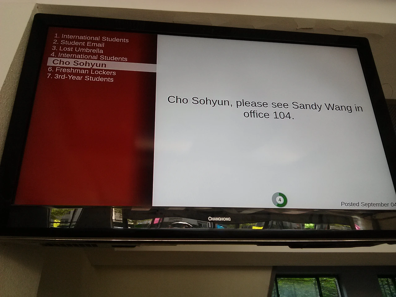우리 학교 1층에는 여러 공지사항들을 올려두는 TV 스크린이 있다. 국제학생들을 위한 미팅 (비자 등의 안내를 위한)이나 사물함 관련 변경 사항, 또는 잃어버린 물건을 찾아가라는 등의 안내를 하곤 하는데, 어느 날 이렇게 내 이름이 떡하니 티브이를 장식한 적이 있었다. 오고 가며 알림을 본 사람들은 너도나도 내게 연락을 하기 시작했고, 한국인 언니 오빠들부터 외국인 친구들, 그리고 중국 친구들까지 여러 사람들이 메시지를 보냈다. 학교 앞에서 마주친 교수님들 또한 내게 샌디를 찾아가 보라고 말해주었다. 혹시 동명이인이 아니겠냐고? 중국 캠퍼스에서 Cho, Sohyun이라는 이름을 쓰는 사람은 공교롭게도 '나 하나'였고, 저건 내 이름이 맞았다. 교수님들은 나를 찾기 위해서 학년 대표 혹은 section 장에게 연락을 할 필요가 없었다. 혹시나 모를 동명이인들에게 줄 혼란을 막기 위해 학번을 넣을 필요도 없었다. 그냥 내 이름 자체가 나를 가리키는 '브랜드명'인 셈이었다.