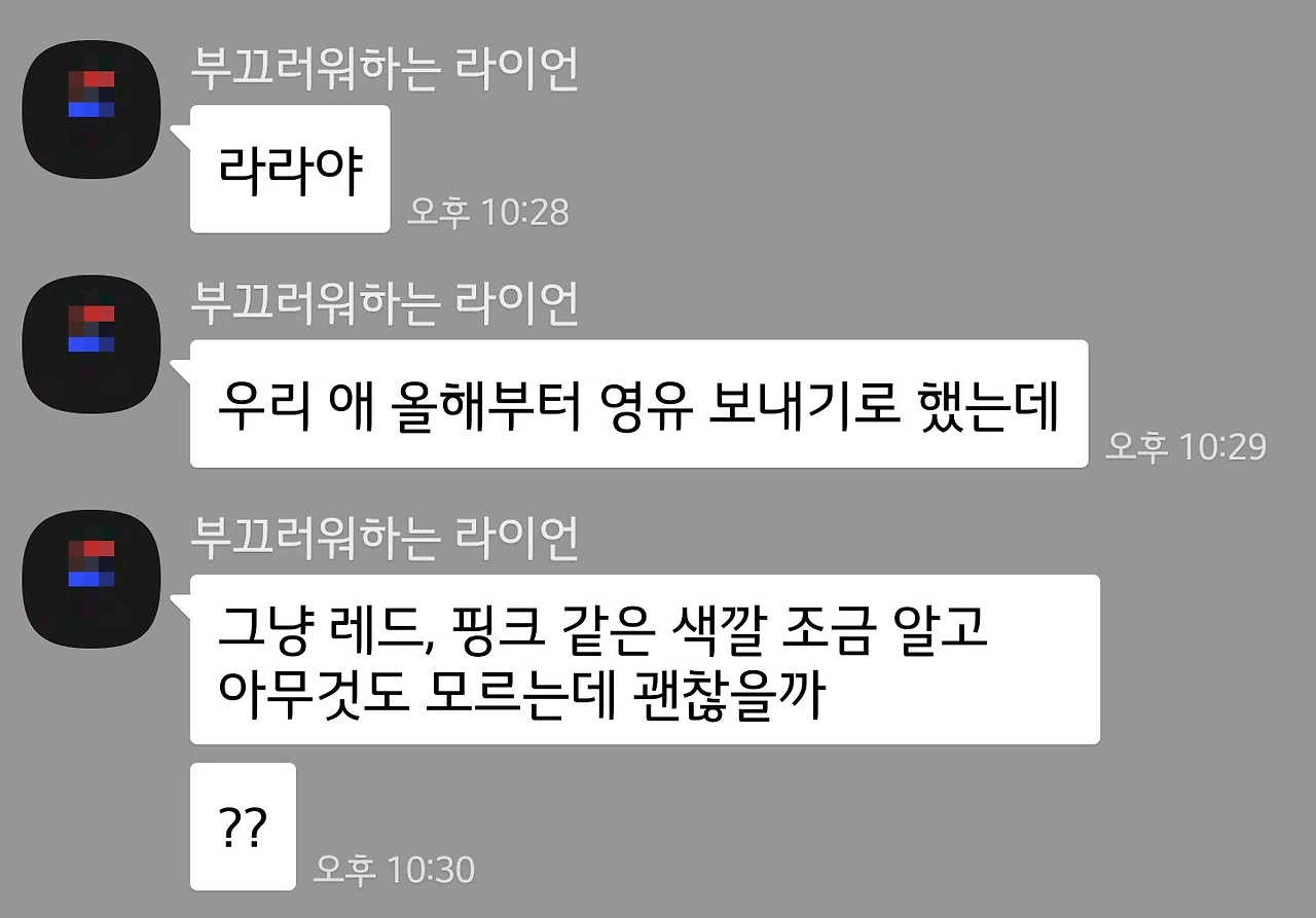며칠 전, 지인에게서 다음과 같은 문자를 받았습니다. 일반 유치원을 다니다가 일곱살이 되어 유치원을 옮기는 경우였는데, ABC노래를 제외하고는 영어의 영자도 모르는 완전 비기너인 친구에요. 제가 영유 고민할때부터 수없이 상담을 해줬었는데, 등록하고 나서도 걱정이 많더라구요. 등록 전에는 국어 공부, 수학공부를 걱정하더니, 이제는 알파벳 모르는게 신경쓰이는가보더라구요.