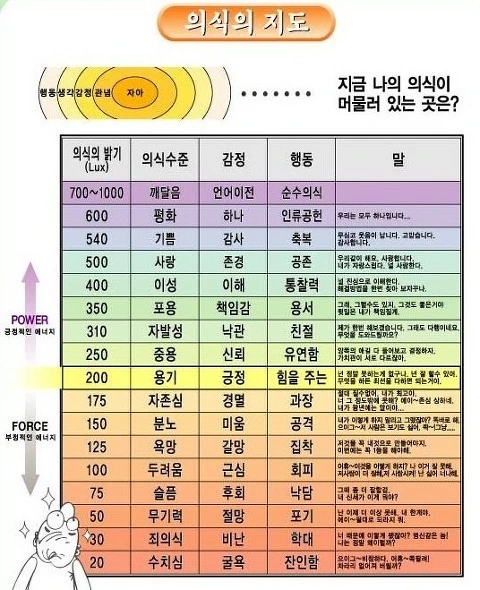 이날의 경험은 아주 작은 첫걸음이었지만 제게는 무엇보다 큰 마음의 발걸음이었어요. 생각으로만, 마음으로만 원했던 걸 실천했던 날이었고 이렇게 조금씩 더 많이 내가 더 많이 사랑하면 되겠구나, 다짐하게 됐어요. 조금 다른 이야기지만 어떤 폭력에 대응하는 가장 좋은 방법 중 하나는 그것보다 더 높은(에너지의 크기가 커서 다 품어버리는) 수준의 의식을 써보는 것이거든요. (아래 표를 한번 참고해 보세요)