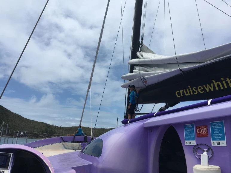카미라 요트트립은, 휘트선데이 제도에서는 보라색 요트로 유명하다. 대부분 30명-70명 그룹으로 진행되는 소규모 투어다. 첫날은 다행히 30명정도밖에 타지 않아서 조금 여유롭게 이것저것 일을 배울 수 있었다. 하지만 그 다음부터는 70명 이상 풀로 꽉꽉 차서 운행했다.