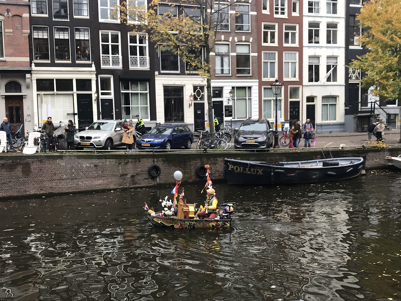 아직까지 뜨거운 감자인 이슈라, 내가 보는 퍼레이드에서는 어떻게 피트가 등장할까 궁금했다. 운하를 따라 경찰 보트들이 먼저 오고 드디어 신터클라스의 도착을 알리는 아저씨가 작은 배를 타고 와서 캐롤같은 노래를 연주했다.