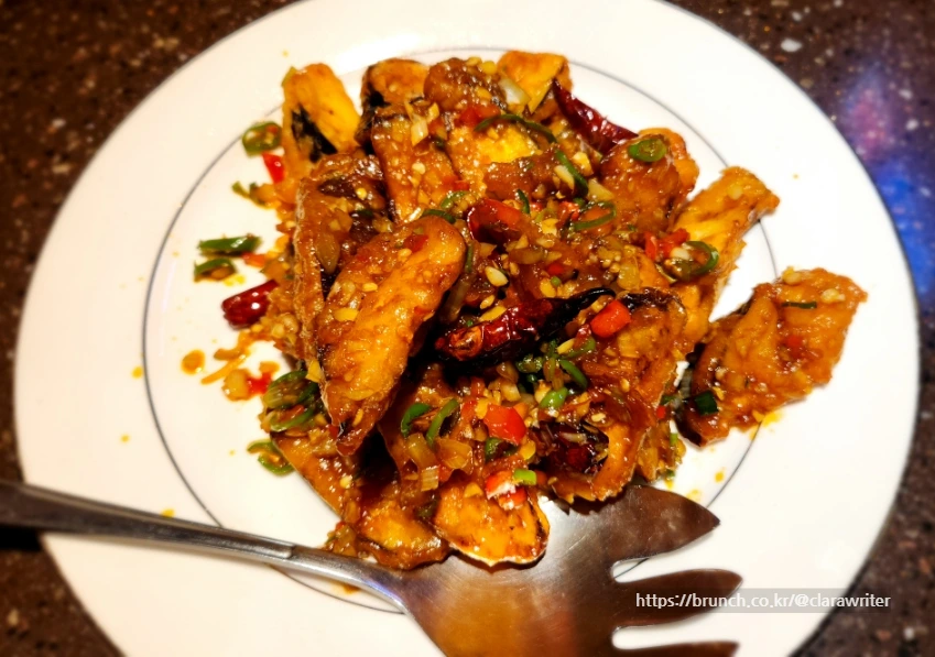 중국에 가서 어향가지를 강력추천하는 사람들이 많았는데, 그들의 말을 믿지 못했지만 속는 셈 치고 주문을 했다. 우와.. 진짜 어향가지를 진작에 먹었어야 했다고 생각이 들 정도로 맛있었다. 겉바속촉으로 촉촉한 가지 속이 좋았고, 겉은 바삭한 식감이 어향가지의 매력이었다.
