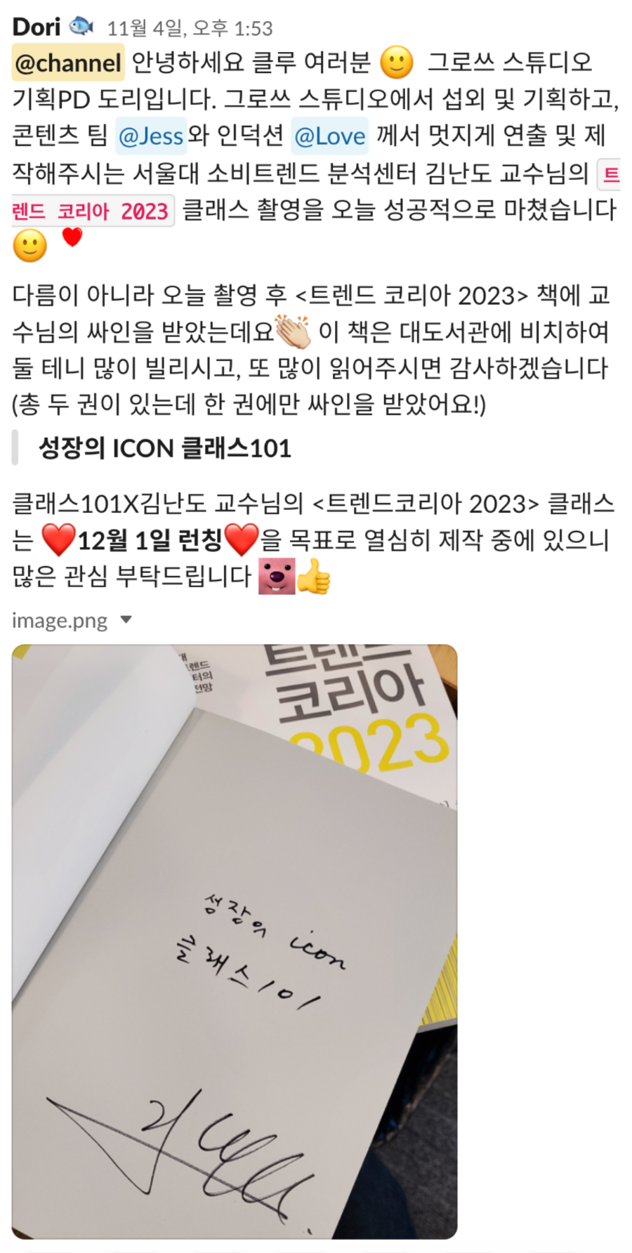 매년 흐름에 올라타고 싶은 사람이라면 교보문고에 들러 꼭, 읽어본다는 그 책. 바로 트렌드 코리아 시리즈. 다가오는 2023년도의 트렌드를 미리 분석하고 벌써 베스트 10에도 들어간 트렌드 코리아 2023의 저자 김난도 교수님이 말씀하신 ‘성장의 아이콘, 클래스101’의 도서관에 친필 사인이 들어간 책이 도착했습니다!