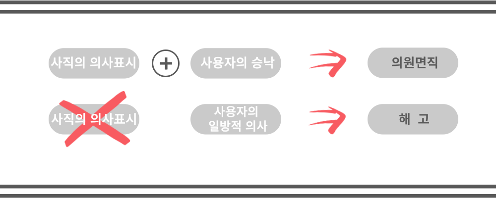 비진의 의사표시에 해당한다면, 사용자가 이를 알았거나 알 수 있었을 경우인지를 판단하여야합니다. 표면상 의원면직으로 보일지라도 실제로는 해고에 해당하는 경우가 있기 때문에 양자의 구별이 쟁점이 됩니다.