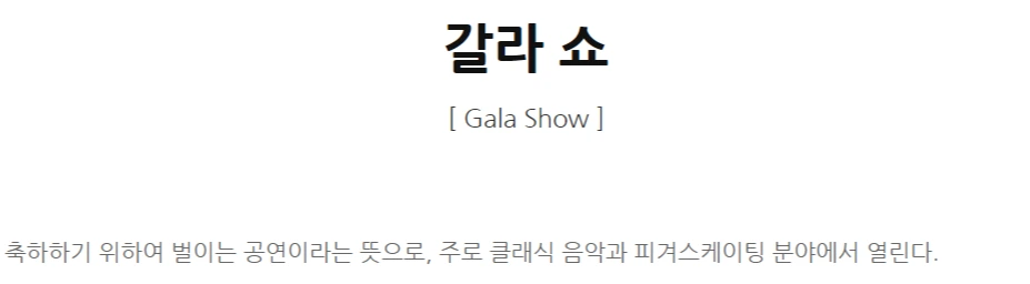 갈라쇼 혹은 갈라콘서트 라는 단어 또한 피겨스케이팅에서 어떤 의미로 사용되는지 알아보자.