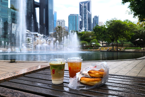 그렇게 어느 토요일 아침, 아이와 나는 눈 뜨자마자 공원으로 향했다. 가는 길에 몰에서 평소 줄 서서 사 먹어야 하는 비프 로띠도 가뿐히 사고, 맞은편 카페에서 커피와 음료도 샀다. 이렇게 피크닉 준비 완료!