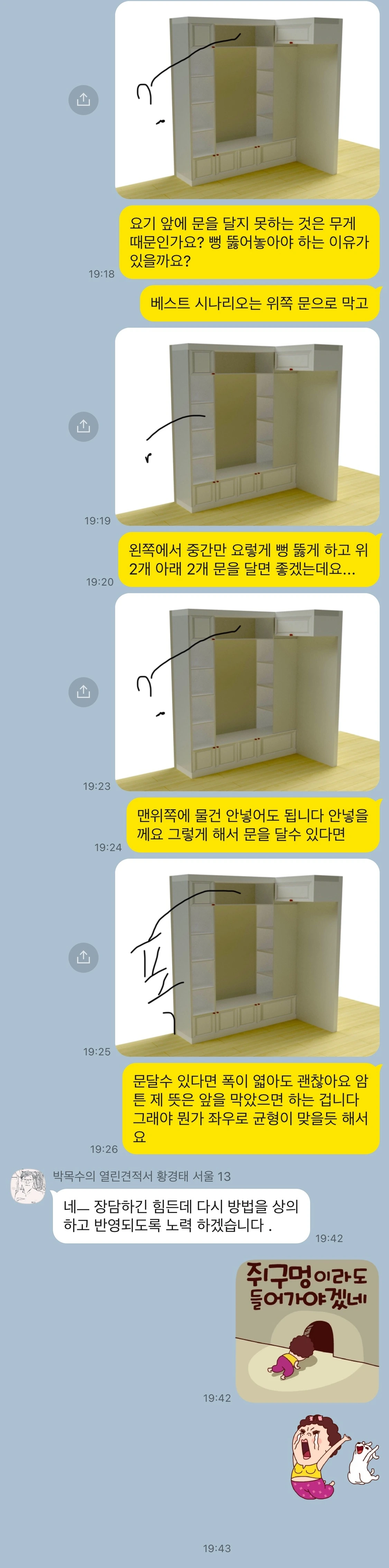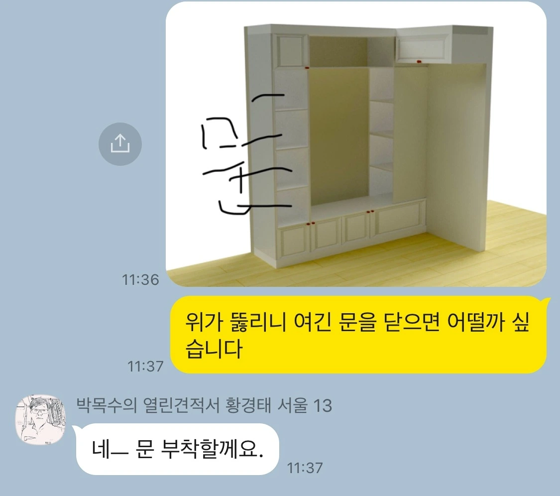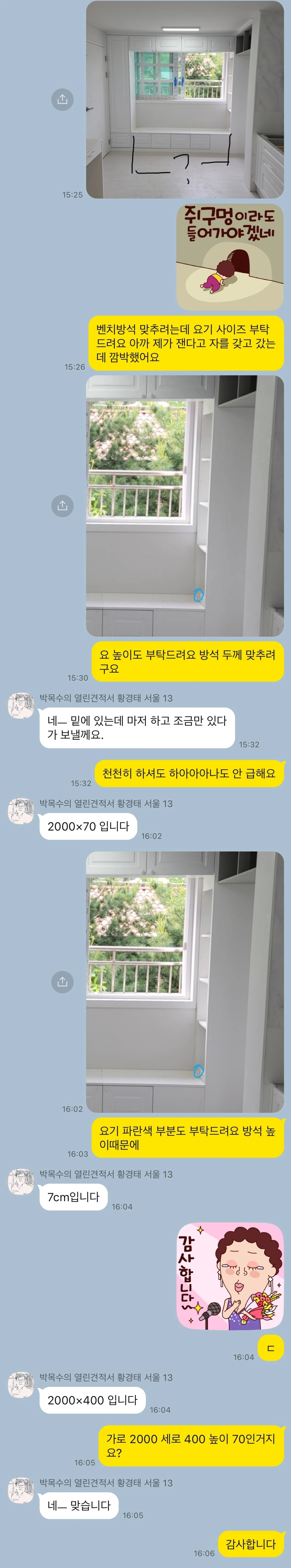 내 사정이 이러하니 이 집을 처음 본 순간부터 리딩 누크(reading nook)라고도 불리는 window seat을 희망했고 인테리어 실장님으로부터 처음엔 '한번 해보자'라는 답을 받았으나 실내공사 중반부엔 '불가능하다'는 연락을 받았어도 포기되지 않았다. 가격이나 공사의 난이도로 힘들거나 불가하다는 여타 희망사항들, 예를 들어 히든 도어나 무 몰딩은 손가락 사이 모래알처럼 손쉽게 놓아 버렸어도 window seat은 죄송함을 무릅쓰고 다시 한번, 그래도 다시 한번 부탁하게 되었다. 인테리어 실장님과의 톡을 짚어보니 '내가 쥐구멍에 들어가는' 이모티콘이 제일 많은 곳이 window seat에 관해 협의하는 내용들 사이사이였다.