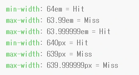 그래서 다시, 소숫점 6자리를 사용한 EM은 여전히 희망이 없네요. 게다가 미디어 쿼리에 픽셀을 사용해도여전히 640px/639px에서 문제가 생깁니다. 픽셀 단위가 EM과 REM 단위를 무시하기 때문입니다. 미세한 차이지만 매우 거슬리는 문제가 생기는거죠.