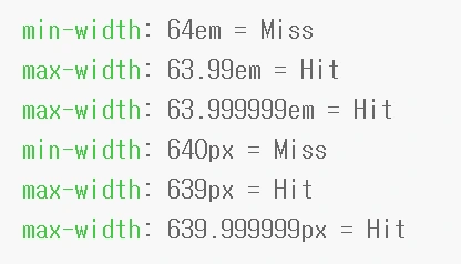안타깝게도, 이 문제에 대한 정확한 해답은 없습니다. 웹 브라우저 엔진 자체가 이 문제를 해결할 수 없는 한, 여전히 미세한 차이에 의한 문제를 해결하지 못한 채 사용해야한다는 거죠. 그나마 가장 간단하게 허용할 수 있는 옵션은 css 코딩시 동일한 블록에 최소 폭과 최대 폭을 중첩되게 사용하지 않는 방법뿐입니다.