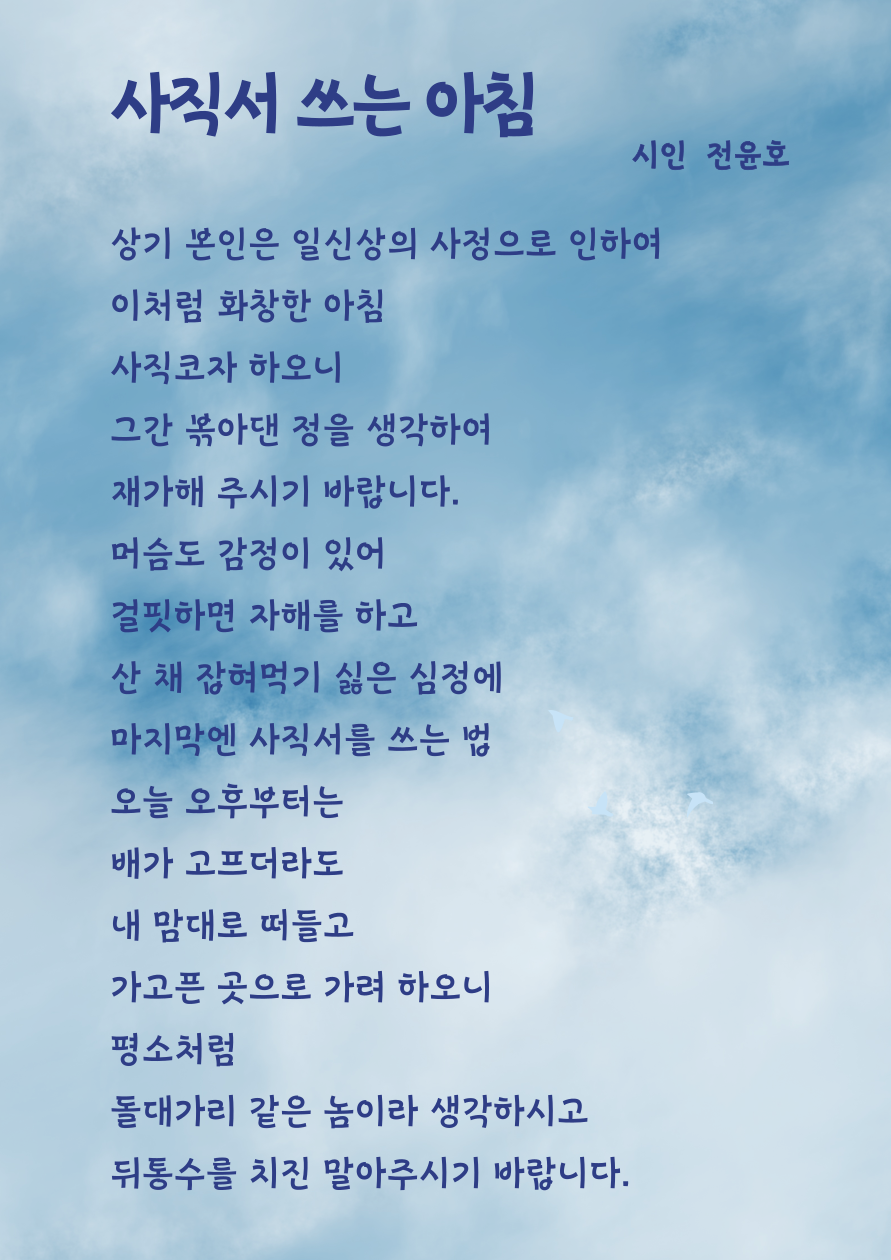 저자가 책에서 소개하는 60여편의 시 중에서 나는 유독 전윤호 시인의 <사직서 쓰는 아침>이 기억에 남는다. 아마도 나의 고통의 시간은 지금은 '밥벌이'인가 보다.