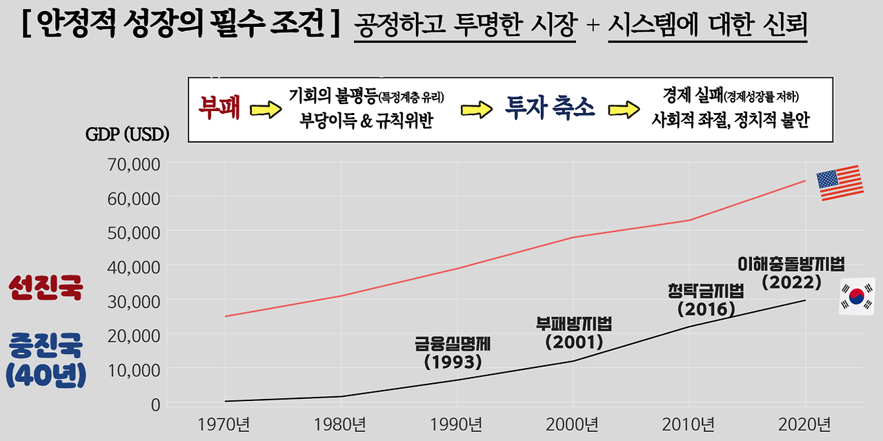 이렇게 시스템에 대한 신뢰도가 낮고 공정하지 못한 사회는 투자를 통한 지속적 성장이 불가능하다. 어느 바보가 믿을 수 없는 기업(사회)에 투자를 하겠는가?