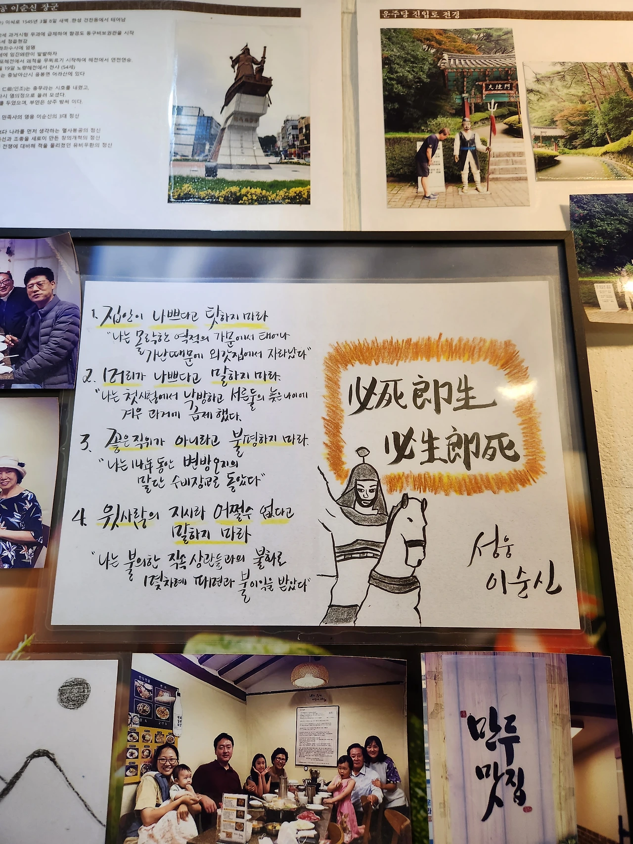 둘러보니 유명한 맛집 답게 복도의 양쪽 벽은 방문자들의 사진과 싸인으로 빼곡하다. 그런데, 재미있는 점이 가장 넓은 면을 할애하여 이순신 장군의 어록과 '운주당' 이야기를 정성스럽게 써놓은 것이다.