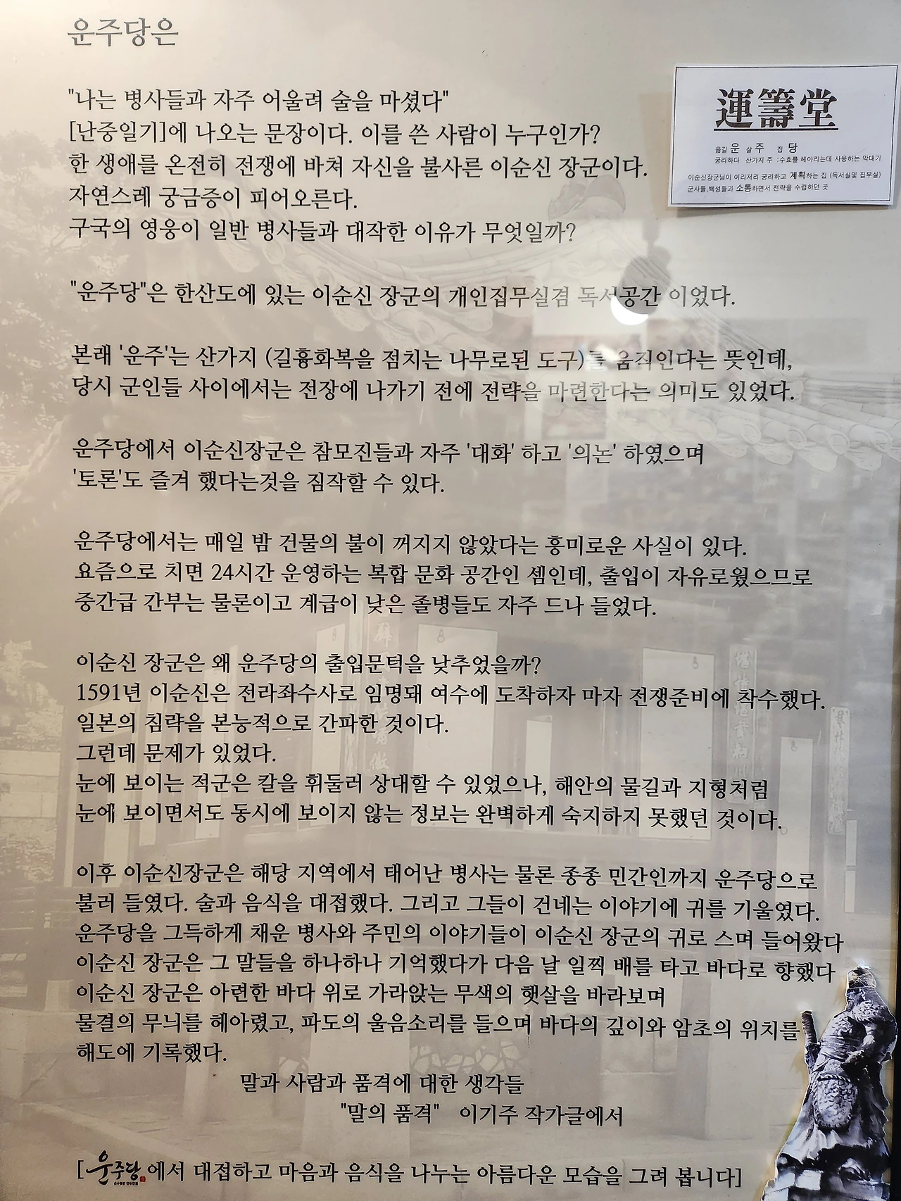 운주당(運籌堂)은 '지혜로 계책을 세운다'는 뜻인데, 난중일기 속 이순신은 개인 서재인 이 공간을 병사들과 밤낮 없이 방책을 세우고 의논을 하던 공간으로 운용했었다. 모두에게 오픈하고 격 없이 소통하던 회의실이자 휴게실이었으며, 23전 23승의 역사가 시작된 이순신 소통 리더십의 중심이었다.