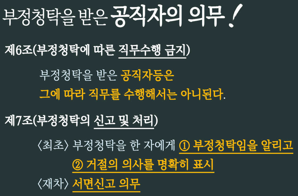 그리고, 「청탁금지법」제6조 내지 제7조는 공직자가 누군가로부터 부정한 청탁을 받은 경우에 대한 구체적 행동기준을 제시하고 있다.