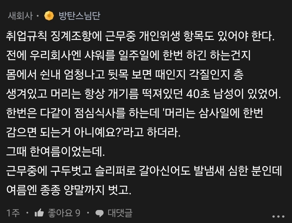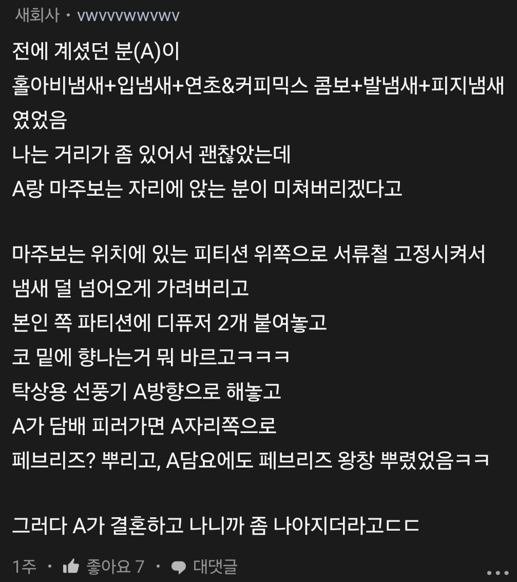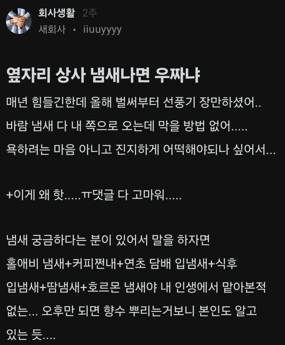 '냄새'가 사무실 갈등의 하나일 수 있음은 인정해야 겠다. 그렇다면, 팀워크와 개인의 성장관점에서라도 소통과 해결의 방법을 고민해 볼 필요가 있겠다.