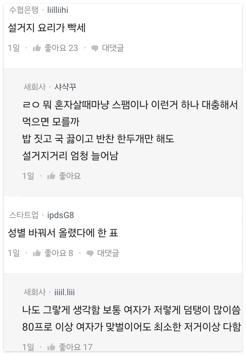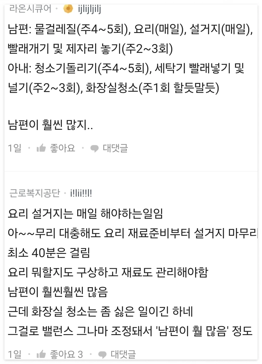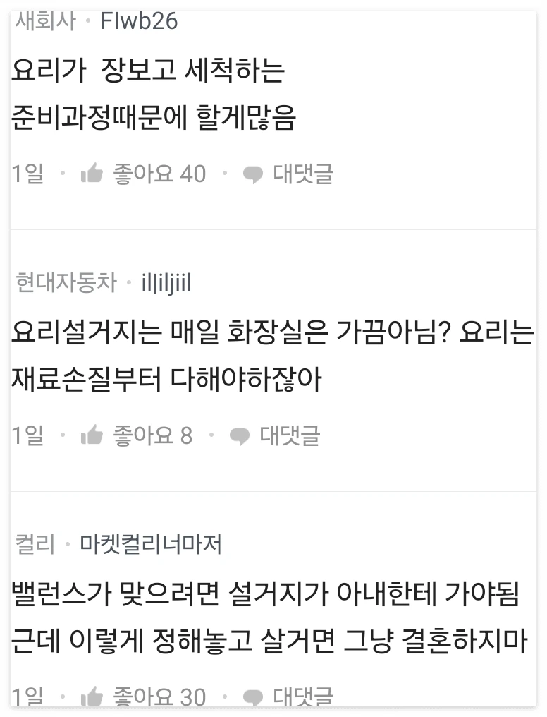 블라인드에는 부쩍 가사분담의 억울함을 토로하는 새내기 부부들의 넋두리가 많아지고 있다. 이혼 하겠다 정도의 격한 감정은 아니지만, 계속 손해보고 있다거나 공정하지 못하다는 찜찜함을 드러내는 정도이다.