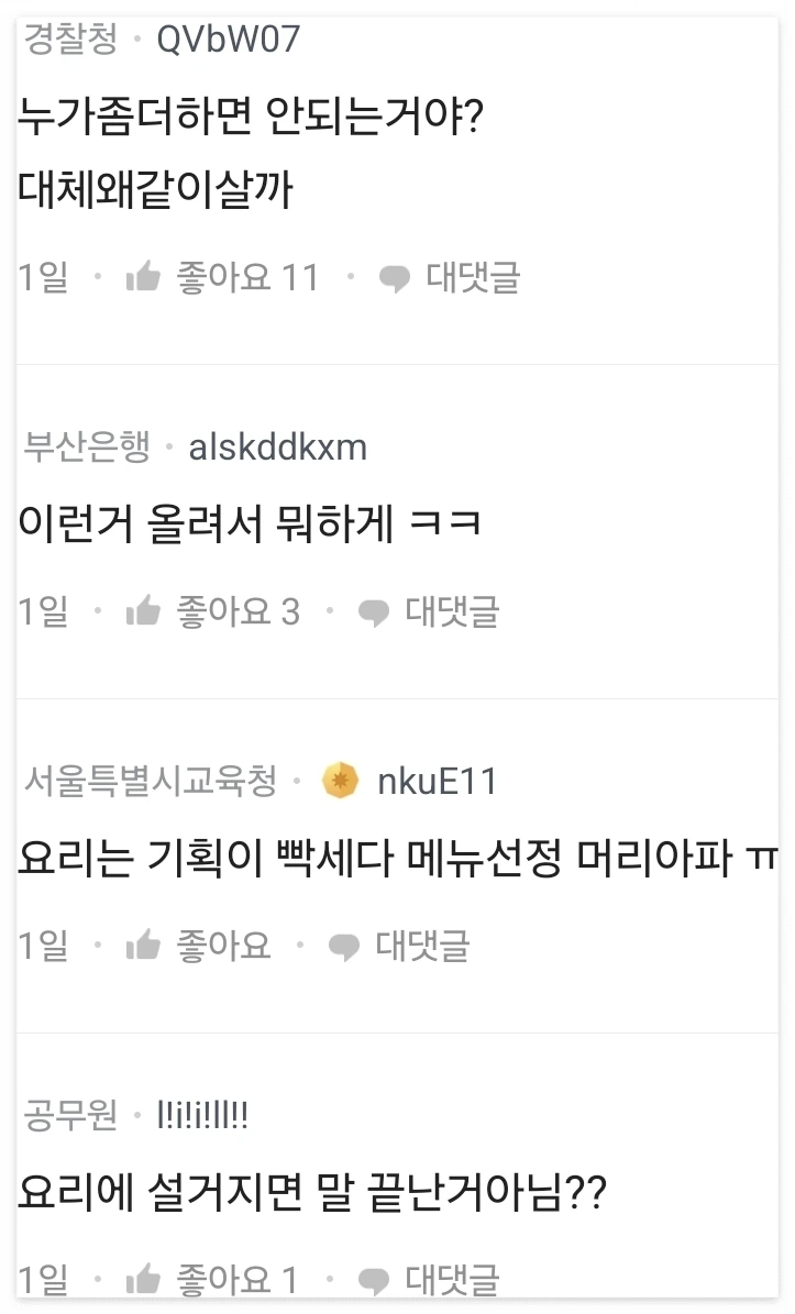 누가 더 힘들까?라는 질문에 대해 투표 참여와 토론도 열정적이다. 남편과 아내에 감정이입을 하여 공정하지 않은 가사노동 현실을 다투는 건 아마도 이런 비슷한 생각과 갈등을 겪는 사람들이 많아서일 것이다.