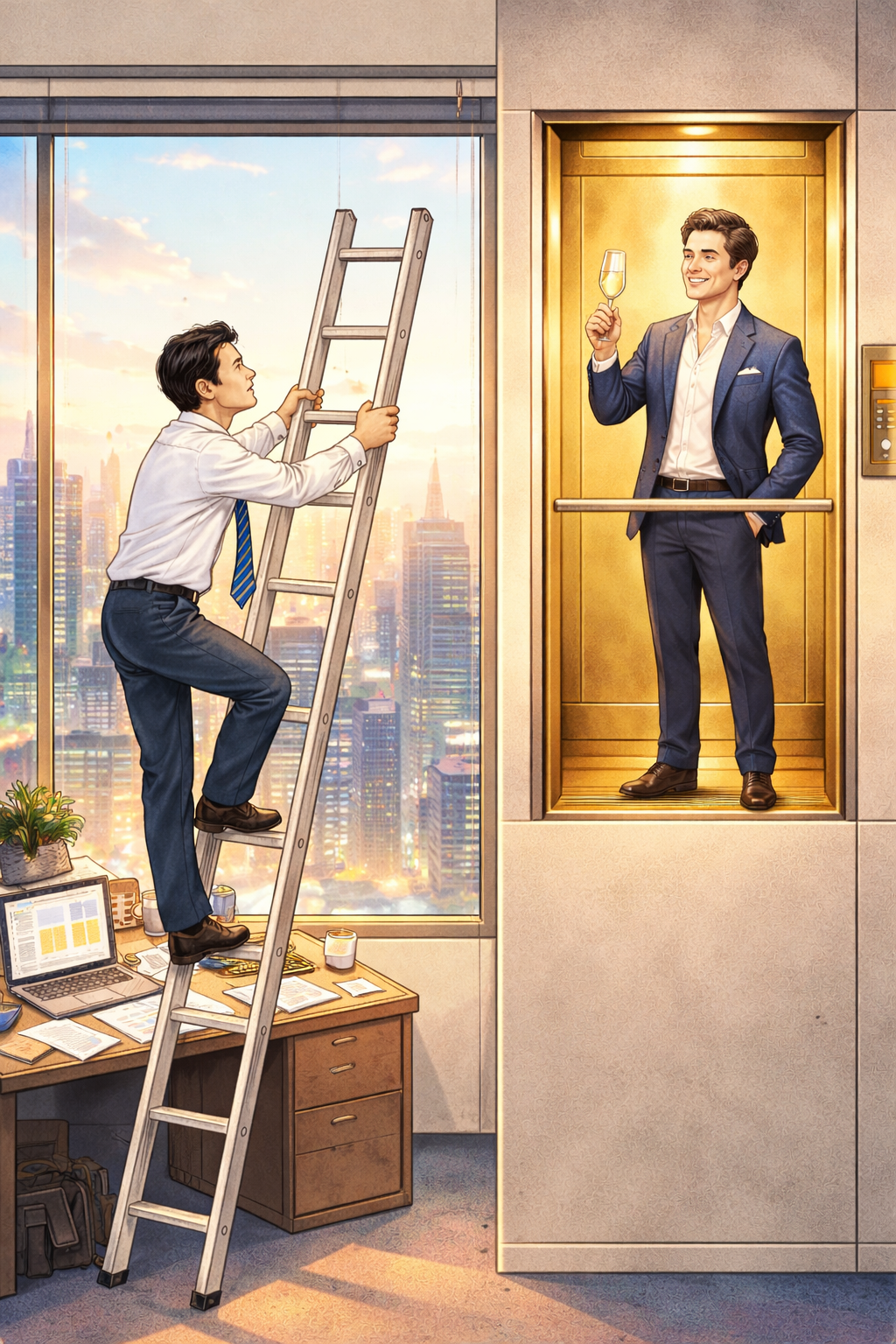 그는 현대 사회의 화이트칼라 신화 그 자체이다. 그동안 회사를 위해 청춘을 바쳤고, 아들 졸업식에도 한번 가본적이 없을 정도였다.